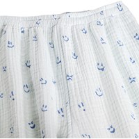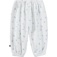 Blå byxor för de små i ekologisk bomull med ett glatt mönster. De har en lös passform, elastisk midja och resår vid anklarna, vilket gör dem lätta att ta på och av. Byxorna är lätta och bekväma vilket gör dem perfekta för vardagsbruk.