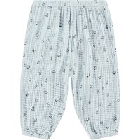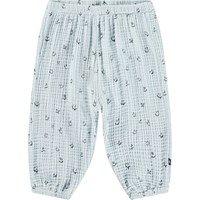 Ljusblå byxor för de små i ekologisk våffelbomull. Byxorna har en lös passform och resår i midjan och benen, vilket ger stor rörelsefrihet för ditt barn. De har ett mönster med små leende mörkblå ansikten. Kombinera dem med en matchande tröja för en komplett uppsättning.