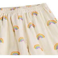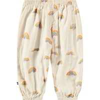 Beiga byxor för de små i ekologisk bomull med regnbågsmönster. De har en lös passform, elastisk midja och resår vid anklarna, vilket gör dem lätta att ta på och av. Byxorna är lätta och bekväma vilket gör dem perfekta för vardagsbruk.