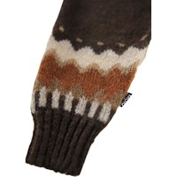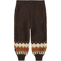 Mörkbruna byxor i ullblandning för de små med ett vävt nordiskt mönster längst ner på byxbenen. Byxorna har en elastisk midja för att göra dem lätta att ta på och av samt muddar vid ankeln. Kombinera dem med den matchande tröjan för en komplett uppsättning.