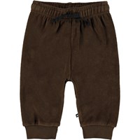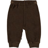 Sigo är ett par mörkbruna velourbyxor till baby med lös passform. Byxorna har gummiband vid besnuten och i midjan.