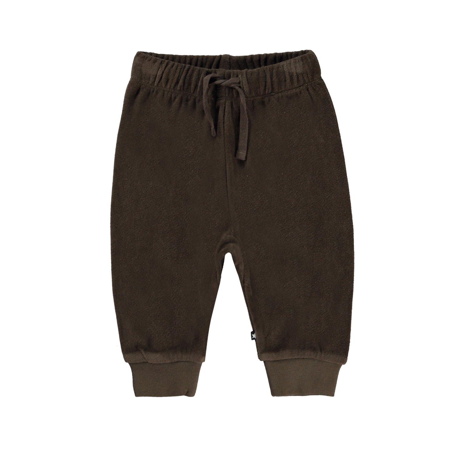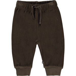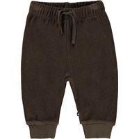 Bruna byxor i mjuk bomullsvelour till de minsta. Dessa byxor är tillverkade i 100% bomull, har gummiband med knytband i midjan och ribb vid fötterna. Matcha ev byxorna med tröjan, Day, i samma mönster för det perfekta setet.