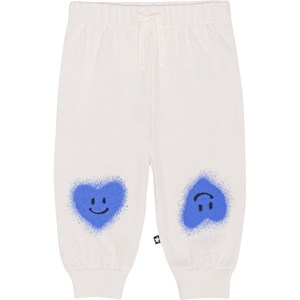 Råvita sweatpants med blå smileyhjärtan på knäna till baby i ekologisk bomull. Byxorna har gummiband med knytband i midjan och ribbkant i benen. Byxorna är enkla att ta av och på samt har massor av plats för rörelse. Detta plagg kan också köpas som ett komplett set med matchande tröja.