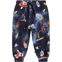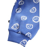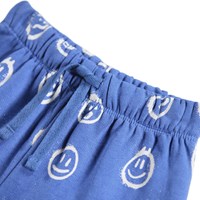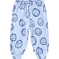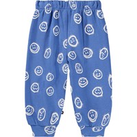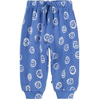 Mjuka byxor för de små i ekologisk bomull. Byxorna är blå med vita ansikten i olika stämningar. Byxorna har resår och snörning i midjan och muddar vid ankeln. De är lätta att ta på och av och har gott om utrymme att röra sig i. Kombinera dem med den matchande tröjan för en komplett outfit.