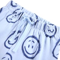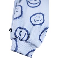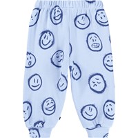 Mjuka byxor för de små i ekologisk bomull. Byxorna är ljusblå med blå ansikten i olika stämningar. Byxorna har resår och snörning i midjan och muddar vid ankeln. De är lätta att ta på och av och har gott om utrymme att röra sig i. Kombinera dem med den matchande tröjan för en komplett outfit.