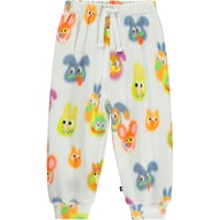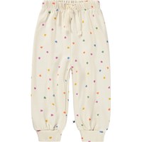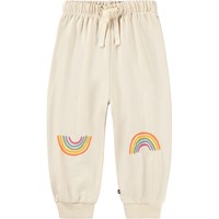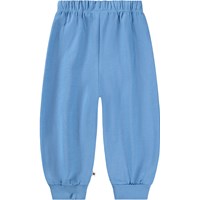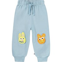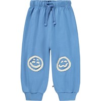 Mjuka, blåa mjukisbyxor för de små i ekologisk bomull med roliga lappar på knäna. Mjukisbyxorna har resår och dragsko i midjan, ribbade kanter vid anklarna och en oborstad insida.