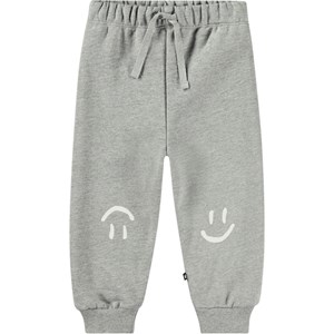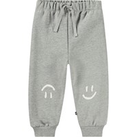 Gråmelerade sweatpants för de små i ekologisk bomull med en borstad insida, vilket gör dem mjuka och varma att bära. Byxorna har gummiband i midjan och dragsko, samt ribbstickade muddar vid benen. De är lätta att ta på och av, har gott om utrymme för rörelse och har små smileys tryckta i vitt på knäna.