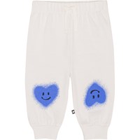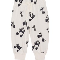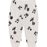 Råvita sweatpants till baby i ekologisk bomull. Byxorna har gummiband med knytband i midjan och ribbkant i benen. Byxorna är enkla att ta av och på samt har massor av plats för rörelse. Byxorna har ett svart mönster av glada hoppande noter. Kombinera byxorna med matchande tröja för ett komplett sweatset.