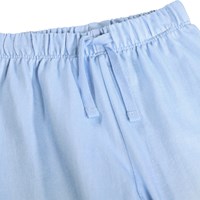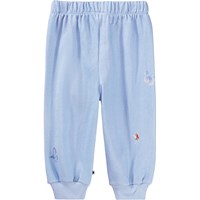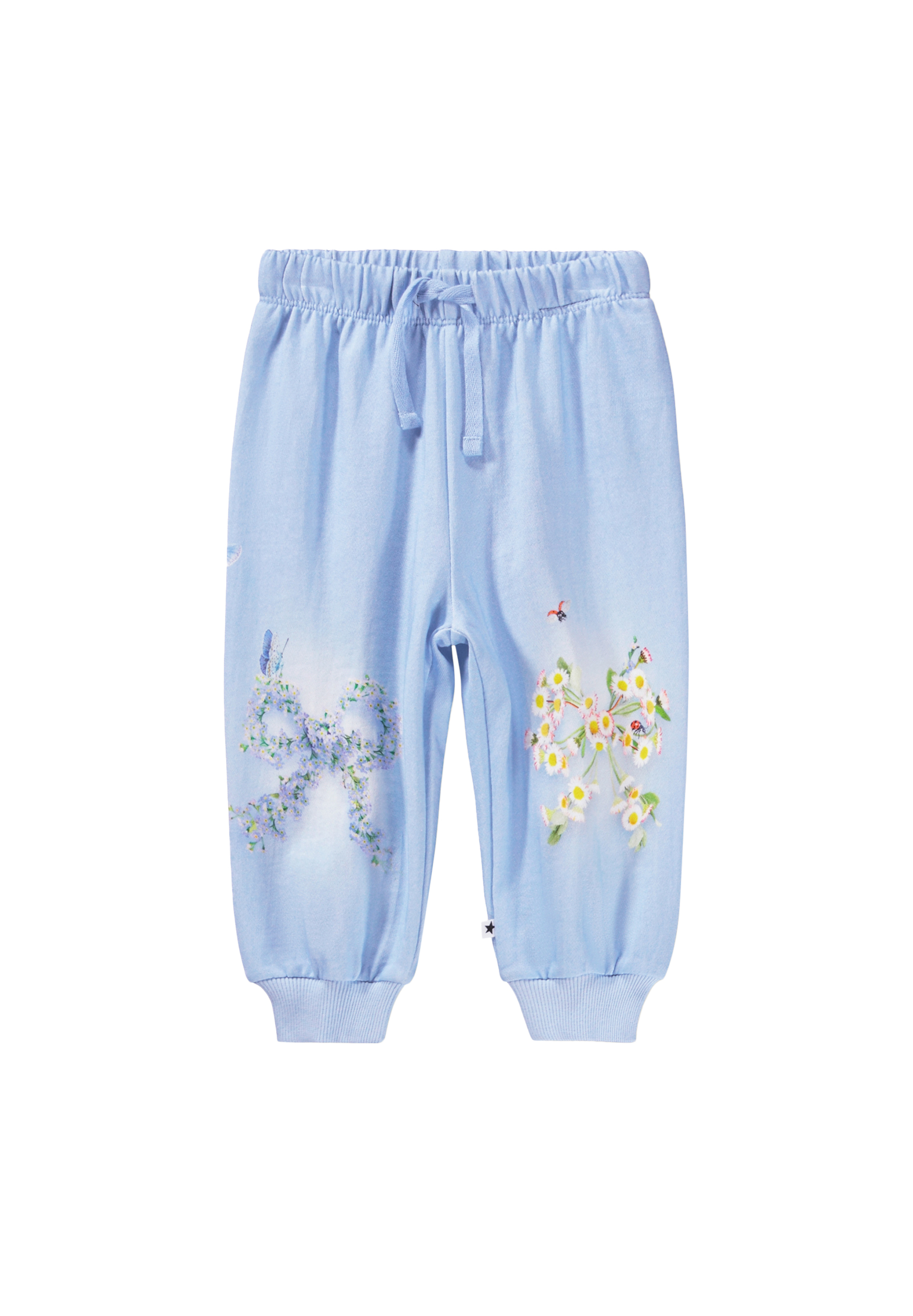 Mjuka, blåa mjukisbyxor för de små i ekologisk bomull med blommönster. Mjukisbyxorna har resår och dragsko i midjan, ribbade kanter vid anklarna och en oborstad insida.