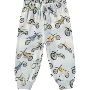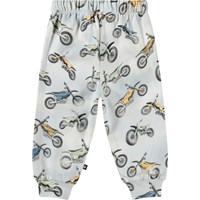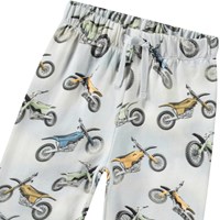 Mjuka byxor i ekologisk bomull för de små. Byxorna har en resår i midjan med snörning och muddar vid ankeln. De är lätta att ta på och av och ger gott om rörelsefrihet. Denna modell har en oborstad insida, vilket gör dem behagligt svala en varm dag. Byxorna är ljusgrå med ett mönster av motocrosscyklar. Matcha dem med en matchande tröja för en komplett outfit.