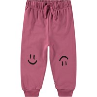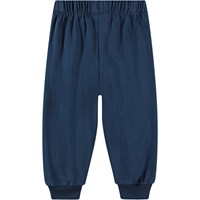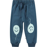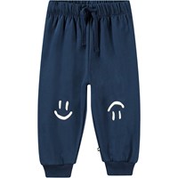 Marinblåa joggingbyxor för de små, tillverkade av ekologisk bomull med en borstad insida som gör dem mjuka och varma att bära. Byxorna har gummiband i midjan och dragsko, samt ribbstickade muddar vid benen. De är lätta att ta på och av, har gott om utrymme för rörelse och har små smileys tryckta i vitt på knäna.