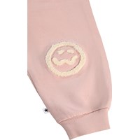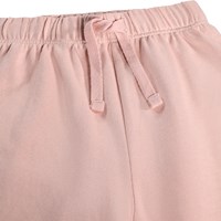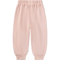 Mjuka, rosa mjukisbyxor för de små i ekologisk bomull med roliga lappar på knäna. Mjukisbyxorna har resår och dragsko i midjan, ribbade kanter vid anklarna och en oborstad insida.