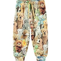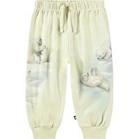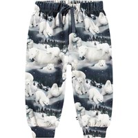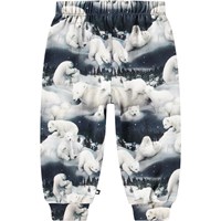 Mörkblåa joggingsbyxor för de små tillverkade av ekologisk bomull med en oborstad insida, vilket gör dem behagligt svala på en varm dag. Byxorna har gummiband och dragsko i midjan samt ribbstickade muddar vid benen. De är lätta att ta av och på och har gott om utrymme för rörelse med mönster av en isbjörnsfamilj som förbereder sig för natten.