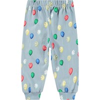 Ljusblåa joggingsbyxor för de små i ekologisk bomull med en oborstad insida, vilket gör dem behagligt svala på varma dagar. Byxorna har gummiband i midjan och dragsko, samt ribbstickade muddar vid benen. De är lätta att ta på och av, vilket ger gott om rörelsefrihet. Byxorna har ett flerfärgat mönstertryck med glada ballonger i olika färger.