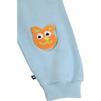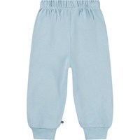 Mjuka, blåa mjukisbyxor för de små i ekologisk bomull med roliga lappar på knäna. Mjukisbyxorna har resår och dragsko i midjan, ribbade kanter vid anklarna och en oborstad insida.