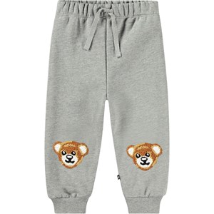 Gråa joggers i ekologisk bomull för de små. Byxorna har gummiband i midjan och dragsko, samt ribbade muddar vid anklarna. De är lätta att ta på och av och ger gott om rörelsefrihet. Det finns också teddybjörnspatchar på knäna. Dessa byxor har en borstad insida, vilket gör dem mjuka och varma att ha på.