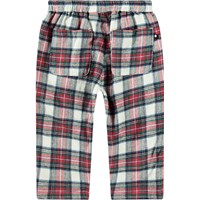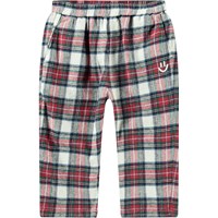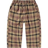 Röd, svart och vit rutig byxor för de små gjorda av ekologisk bomull. Byxorna har en lös passform, fram- och bakfickor och gummiband i midjan, vilket gör dem lätta att ta på och av. De är lätta och luftiga med gott om rörlighet och har en liten broderad smiley vid fickan.