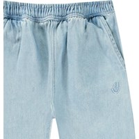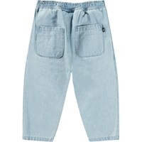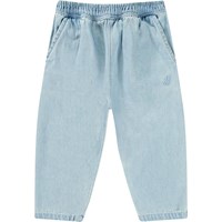 Byxor i ekologisk bomull för de små. Byxorna har en lös passform, fram- och bakfickor, samt en elastisk midja, vilket gör dem lätta att ta på och av. Byxorna är i blå denim med en broderad smiley vid fickan. Matcha med en matchande tröja för en komplett look.
