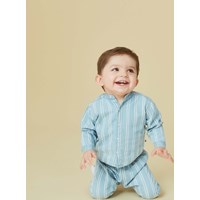 Soy är ett par lätta och breda byxor i ljusblå med fina vita ränder. Byxornaär tillverkade i 100% ekologisk bomull. Kombinera byxorna med matchande skjorta.