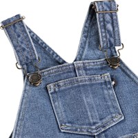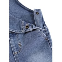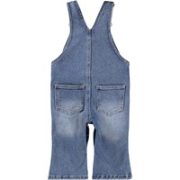 Blå denimhängselbyxor för den lilla i ekologisk bomull med långa ben. Byxorna har dekorativa knälappar, justerbara remmar och tryckknappar på sidorna och mellan benen – men inte mellan benen i storlek 98/104. De är praktiska och bekväma med god rörelsefrihet.