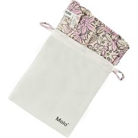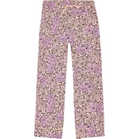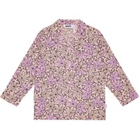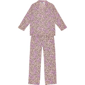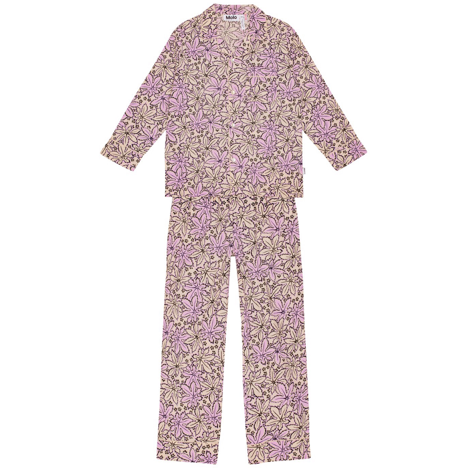 Lila och rosa pyjamas set med långa byxor med gummiband i midjan och snörning. Toppen har långa ärmar, en krage, en bröstficka och knappar framtill. Setet har ett mönster med stora löv och små blommor över hela. Det har en normal passform.