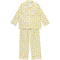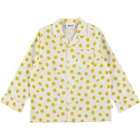 Lex är en vit pyjamas med små gula spraymålade smileys över hela. Lex har vita linjekanter, en bröstficka och knytband i midjan.