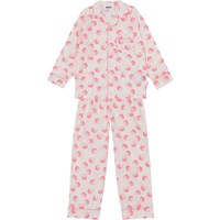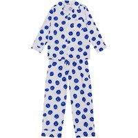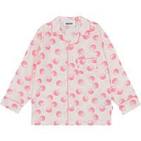 Råvit pyjamas i mjuk ekologisk bomull. Skjortan har långa ärmar med uppvik, bröstficka, knappar och en fin krage. Byxorna är breda med uppvik nertill och gummiband med knytband i midjan. Setet har ett mönster med yin och yang symboler i råvitt och knytband i samma färg som en fin detalj.