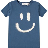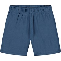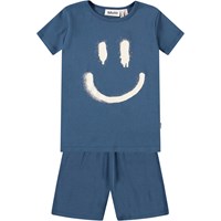 Blå pyjamas med korta ärmar och ben i stretchig ekologisk bomull. Setet är uppdelat i en löst sittande t-shirt med rund hals och ett par shorts med resår i midjan, vilket gör dem bekväma att bära. Setet har en vit smiley på framsidan.