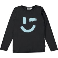 Tvådelad mörkblå pyjamas med en smiley på överdelen. Byxorna har ett snöre i midjan och tröjan har långa ärmar.
