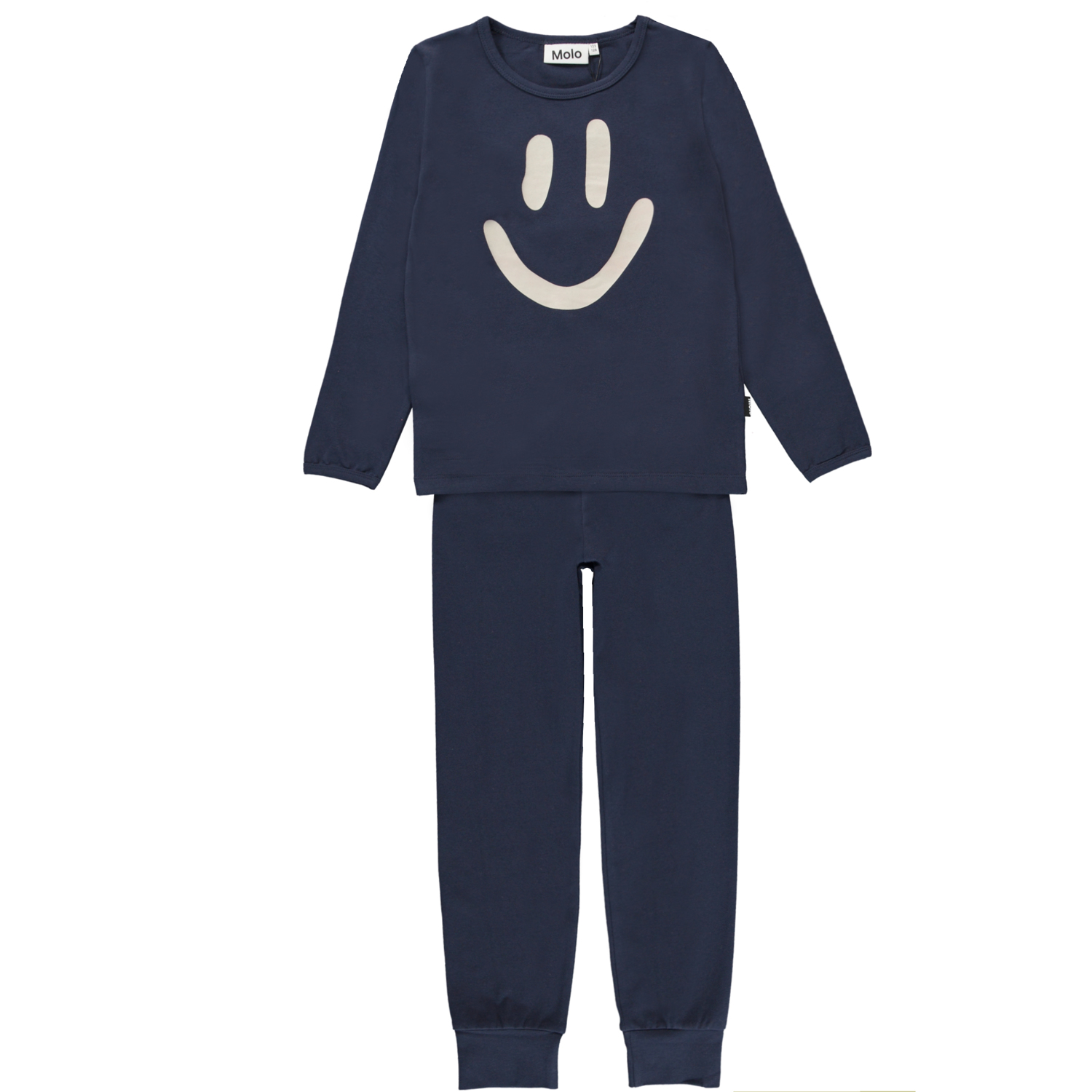 Tvådelad pyjamas i mörkblå med smiley på tröjan. Byxorna har knytband i midjan och tröjan har långa ärmar.