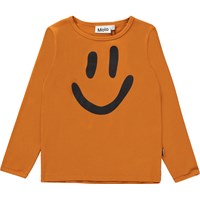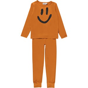 Tvådelad pyjamas i orange med smiley på tröjan. Byxorna har knytband i midjan och tröjan har långa ärmar.