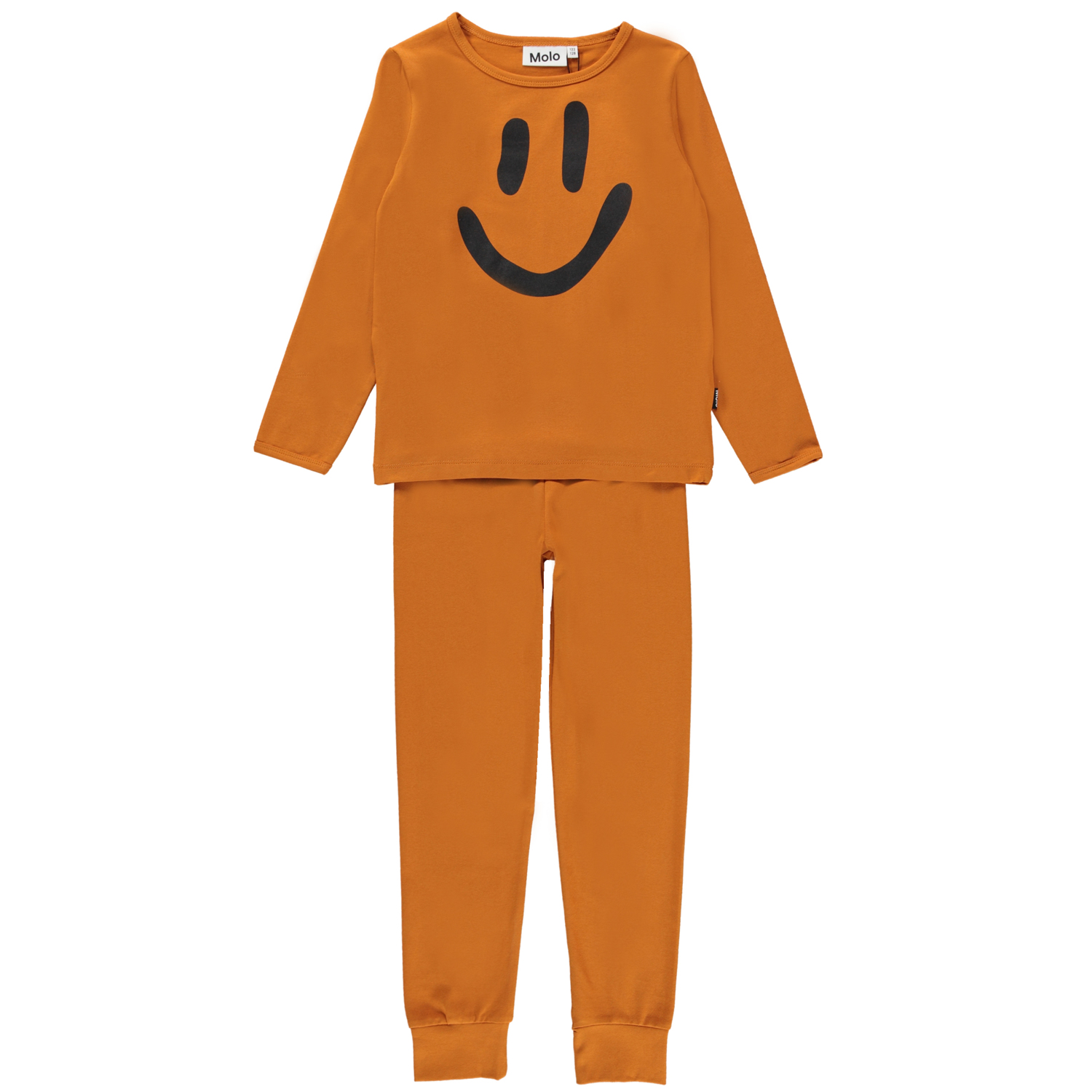 Tvådelad pyjamas i orange med smiley på tröjan. Byxorna har knytband i midjan och tröjan har långa ärmar.