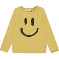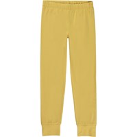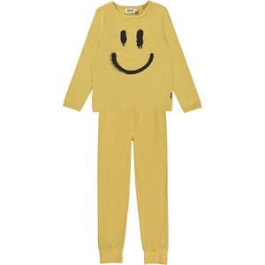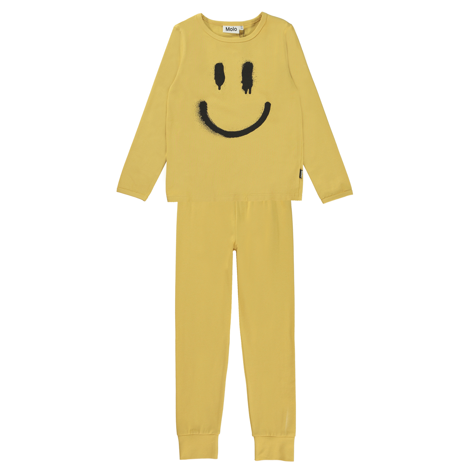 Tvådelad pyjamas i senapsgul med smiley framtill på tröjan. Byxorna har knytband och gummiband i midjan.