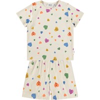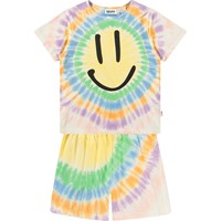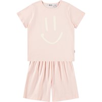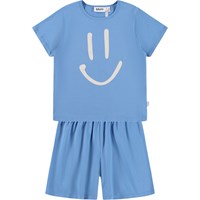 Blå pyjamas med korta ärmar och ben i stretchig, mjuk ekologisk bomull. Setet är tvådelat och består av en lös t-shirt med rund hals och ett par shorts med resår i midjan, vilket gör dem bekväma att bära. Setet har en vit smiley framtill.