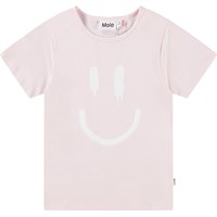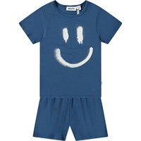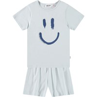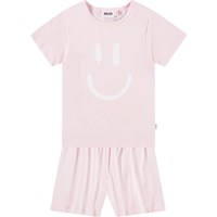 Rosa pyjamas med korta ärmar och ben i stretchig ekologisk bomull. Setet är uppdelat i en löst sittande t-shirt med rund hals och ett par shorts med resår i midjan, vilket gör dem bekväma att bära. Setet har en vit smiley på framsidan.