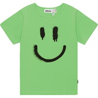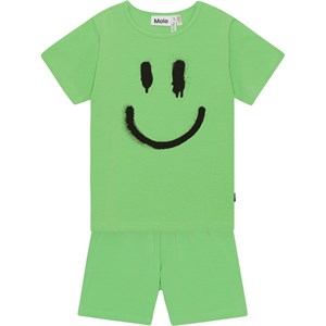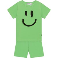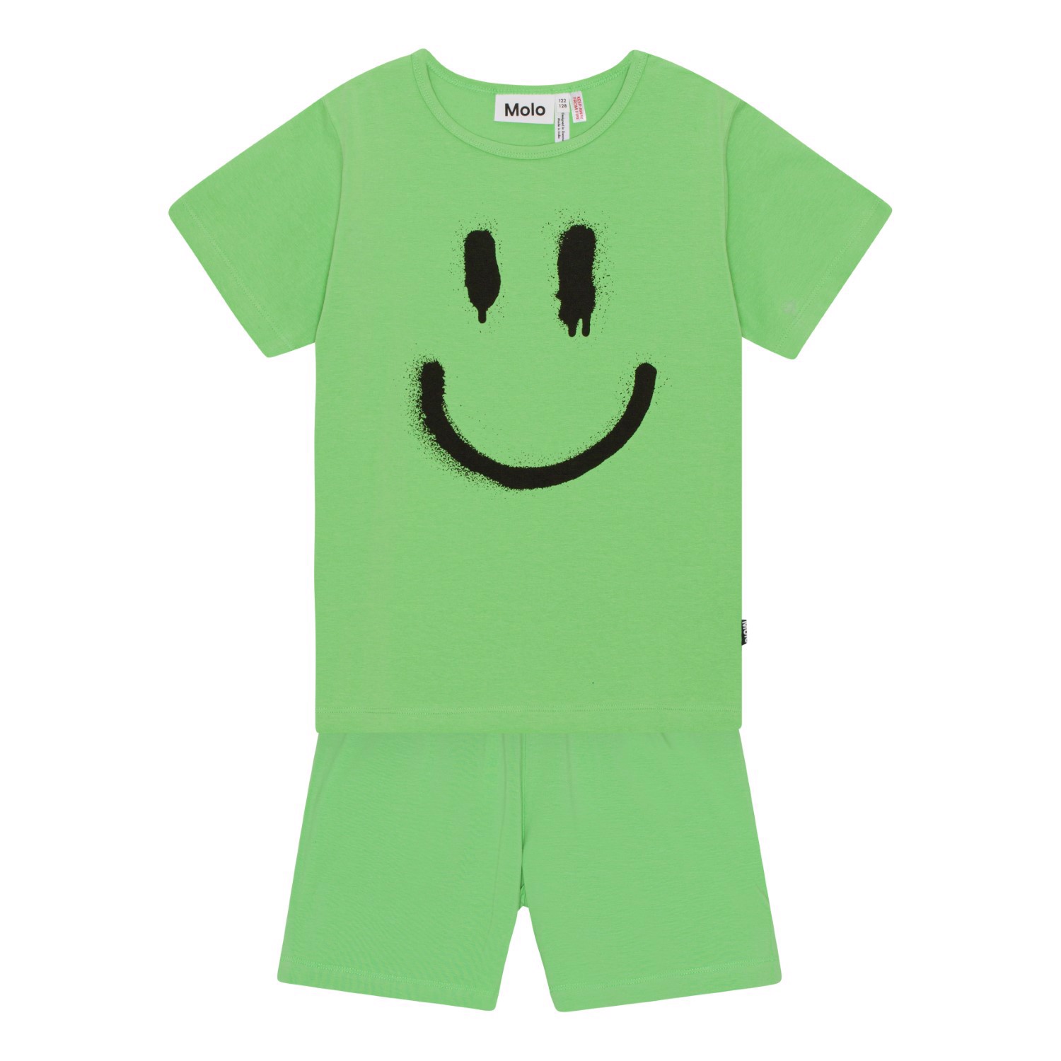 Grön pyjamas med smiley i ekologisk bomull. Setet är tvådelat med en lös t-shirt och ett par shorts med gummiband i midjan.