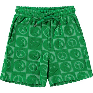 Gröna frottéshorts i en mjuk bomullsblandning med rutigt mönster. I mönstret syns glada emojis, yin-yang symboler och peacetecken. Dessa shorts har gummiband med knytband i midjan, går ca. till knäet, har fickor i sidorna, en bakficka och en normal passform. Den mjuka frottén gör dem perfekta att ta med till stranden eller poolen,