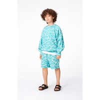 Shorts i turkosblå och vita färger med ett mönster av smälta smileys över hela, i ekologisk bomullsjersey. Shortsen är knälånga, har en lös passform med justerbar midja, fickor i sidosömmarna, en enkel bakficka och ett baggy utseende.