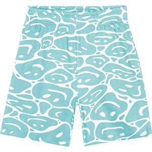 Shorts i turkosblå och vita färger med ett mönster av smälta smileys över hela, i ekologisk bomullsjersey. Shortsen är knälånga, har en lös passform med justerbar midja, fickor i sidosömmarna, en enkel bakficka och ett baggy utseende.