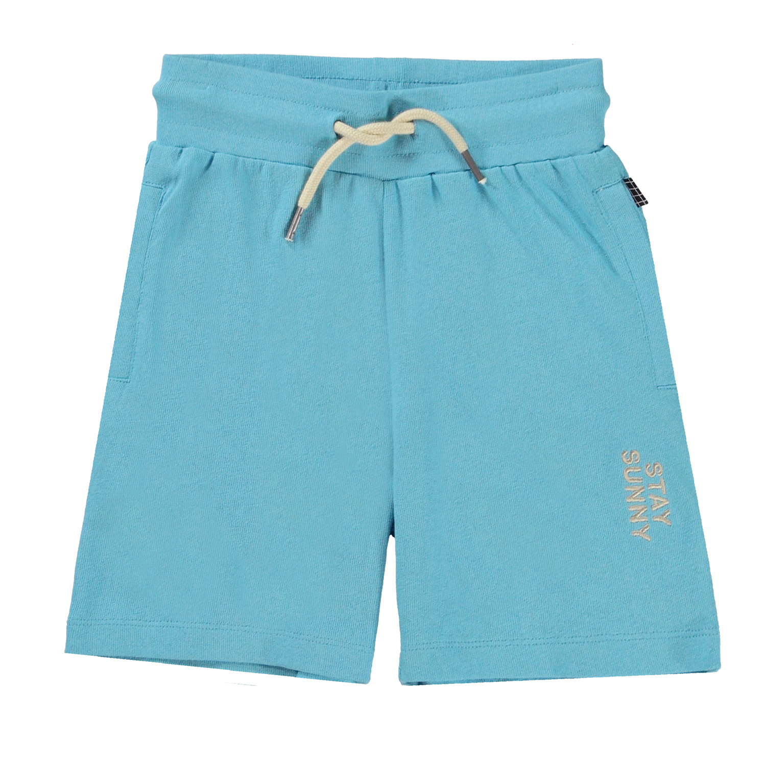Alw är ett par blå shorts i sweat-kvalitet med ribbkant och vitt knytband i midjan. Shortsen har ett fint litet broderi av texten "Stay Sunny".
