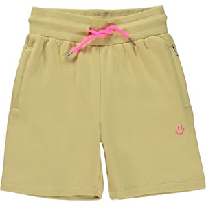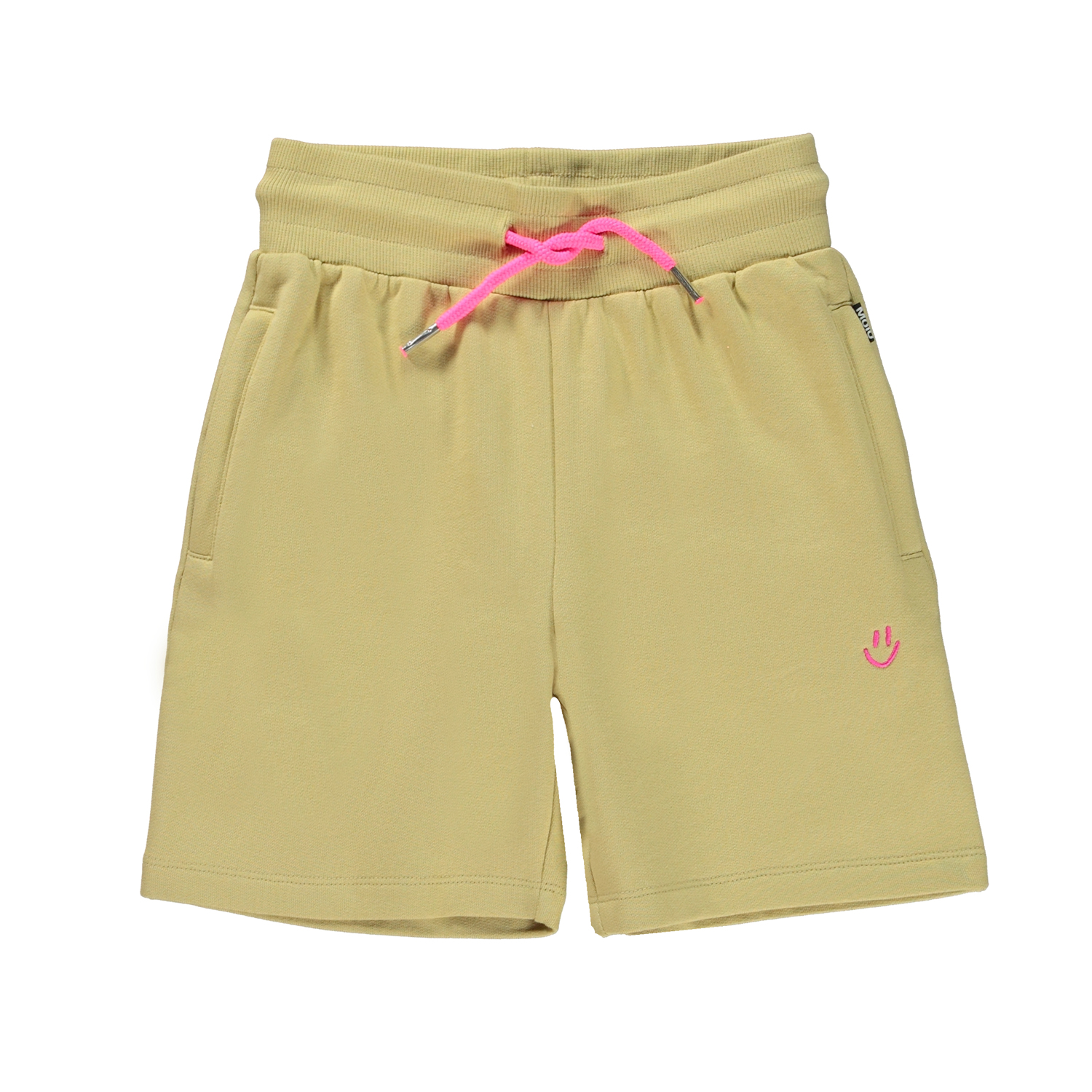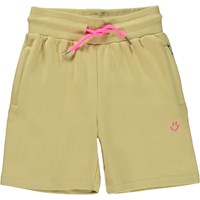 Alw är ett par gröna shorts i sweat-kvalitet med ribbkant och rosa knytband i midjan. Shortsen har ett fint litet broderi av en smiley på den ena fickan.