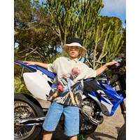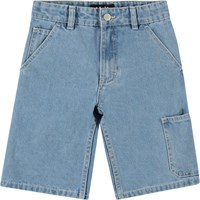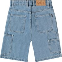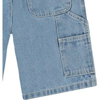 Jeansshorts i bomull med arbetsklädseldetaljer. Dessa shorts är praktiska och har många fickor, både på sidorna och längs benen. De har en lös passform och kan justeras i midjan med invändigt gummiband, så de passar perfekt för alla barn. Storlekarna 92-134 har tryckknappar för enkel på- och avklädning, medan storlekarna 140-176 har en vanlig jeansknapp.