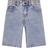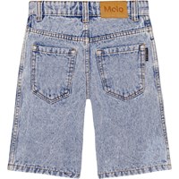 Ljusa jeansshorts tillverkade av ekologisk bomull. Shortsen har fickor fram och bak, en dragkedja framtill och bälteshällor. De är knälånga och har en lös passform. Midjan kan justeras med ett invändigt gummiband vilket garanterar en perfekt passform för alla barn. Storlekarna 92-134 har tryckknappar, vilket gör det enkelt att ta av och på byxorna, medan storlekarna 140-176 har en vanlig jeansknapp.