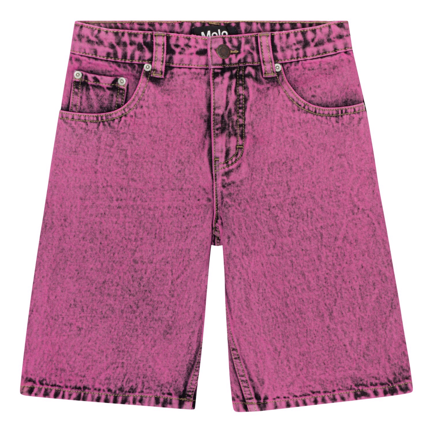Lila knälånga jeansshorts i bomull. Shortsen har fickor fram och bak, tryckknapp och gylf framtill och bälteshällor. Från storlekarna 92-134 har shortsen en invändig knapp till justering av midjan, vilket säkrar passformen och att de kan användas en längre tid. Shortsen har en tvättad och cool look i lila och svart.