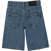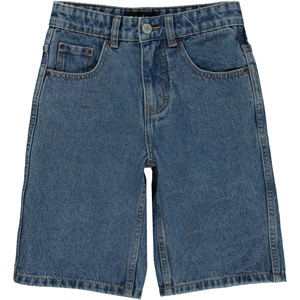 Art är ett par knälånga jeansshorts i en mellanblå tvätt. Shortsen har fickor både fram och bak och en svart läderpatch med logga baktill. Denna Molo vara är tillverkad i certifierad ekologisk bomull.