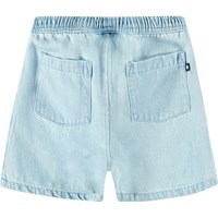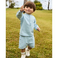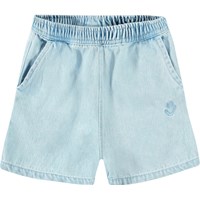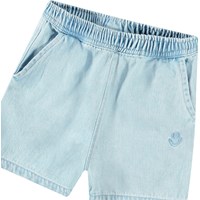 Jeansshorts i ekologisk bomull för de små. Elastisk midja och två fickor. De är ljusblå med en liten broderad smiley. Matcha med en matchande tröja för en komplett outfit.