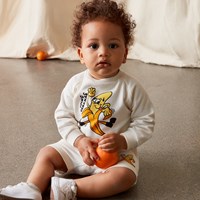 Simms är ett par mjuka babyshorts i råvit med en banan på ena benet. Shortsen har gummiband med knytband i midjan och en enkel bakficka.