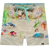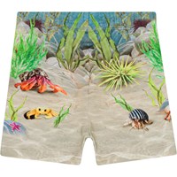 Shorts till baby i mjuk ekologisk bomullsjesrey. Shortsen är tighta med gummiband i midjan med mintgrönt snöre. Shortsen har enbra passform och den mjuka bomullsjesreyn är perfekt till varma sommardagar. I det multifärgade mönstret ser du in i havets botten där du hittar färgrika krabbor och gröna växter.