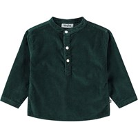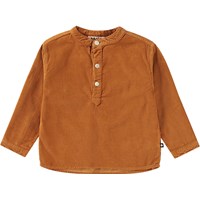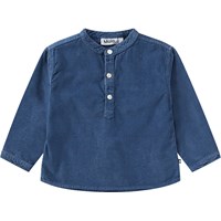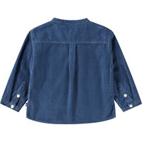 Blå skjorta i ekologisk bomull för de små. Skjortan är tillverkad av mjuk ribbad manchester och har en mandarinkrage och en knappslå med tre vita knappar. Den har en lös passform, vilket gör den bekväm att ha på och enkel att ta på.