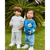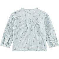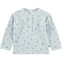Skjorta för de små i ekologiskt skrynklad bomull. Skjortan har en mandarinkrage och knappslå med tre vita knappar. Den har en lös passform, vilket gör den bekväm att bära och lätt att ta på och av. Skjortan är ljusblå med smileys. Matcha med matchande byxor för en komplett outfit.